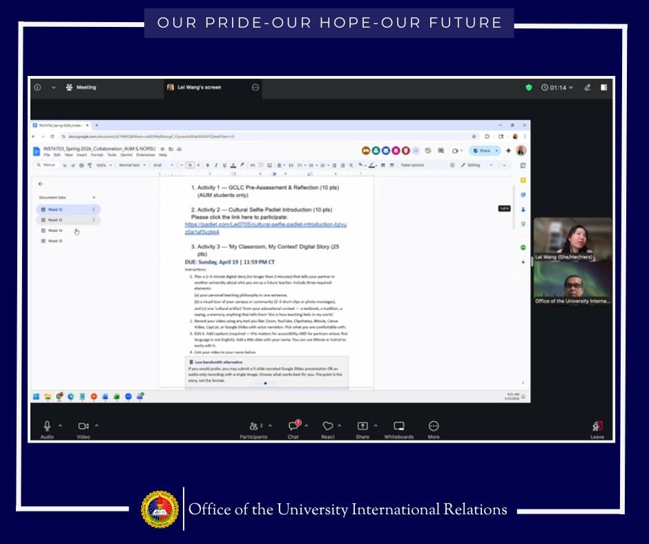 The activity brought together representatives from both institutions to engage in knowledge exchange and strengthen academic collaboration. Representing the Office of the University International Relations (OUIR) was Dr. Craig N. Refugio, Director, who participated in the virtual engagement alongside Dr. Lei Wang of AUM. The session highlighted efforts to integrate global perspectives into academic initiatives and foster meaningful international cooperation.
