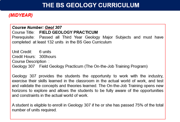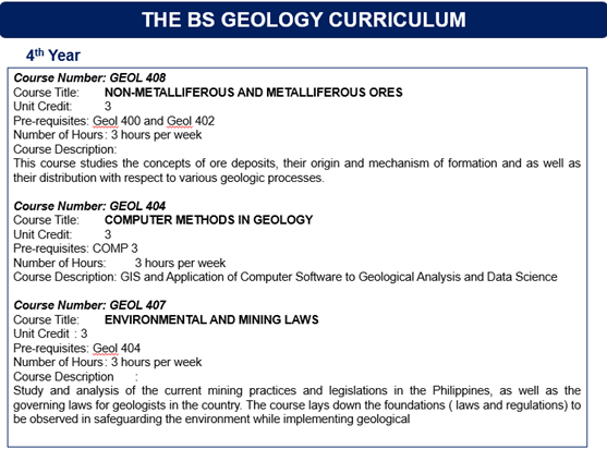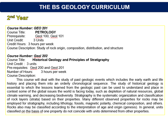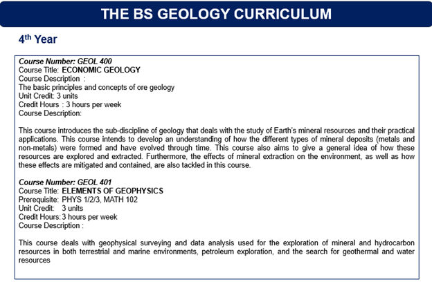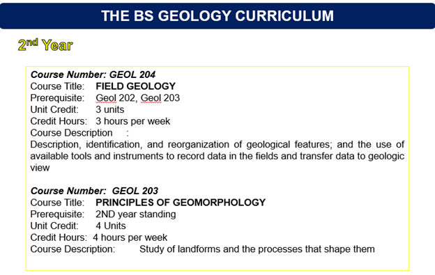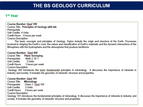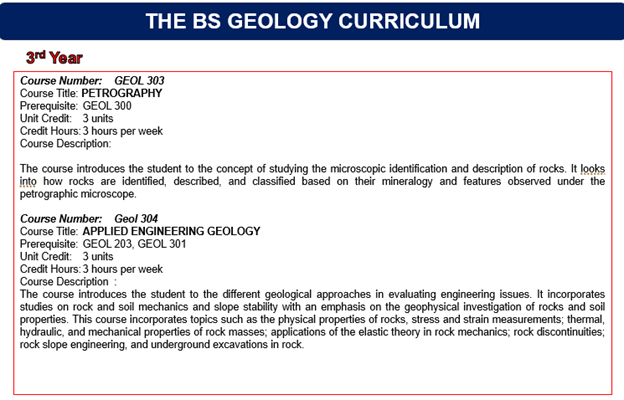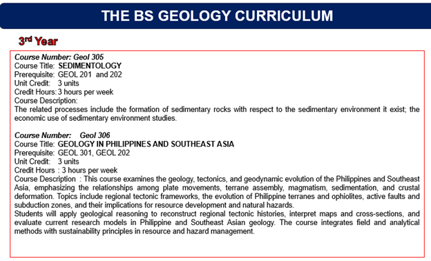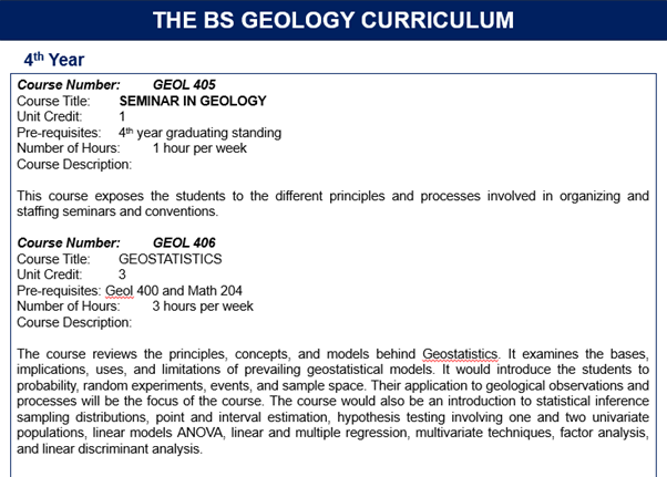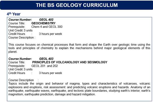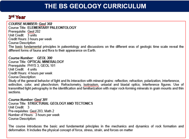 The BS Geology program is committed to fostering a thorough understanding of Earth and its processes, stimulating critical thinking and ground-breaking research, and developing in the graduates a strong sense of duty, ethics, and global responsibility.