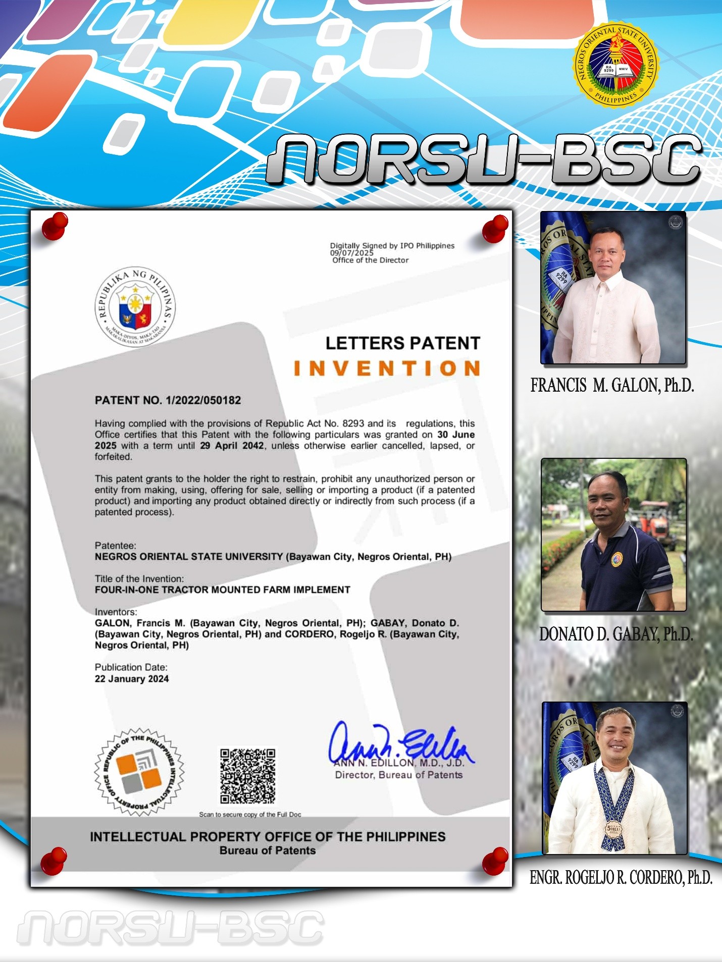 The Four-in-One Tractor-Mounted Implement was granted patent protection on June 30, 2025 by the Intellectual Property Office of the Philippines (IPOPHL). The patent is attributed to its inventors: Dr. Francis M. Galon and Dr. Donato D. Gabay, faculty members of the College of Agriculture and Forestry, and Dr. Rogelio R. Cordero, faculty member of the College of Industrial Technology— all from Negros Oriental State University, Bayawan–Sta. Catalina Campus, Bayawan City.