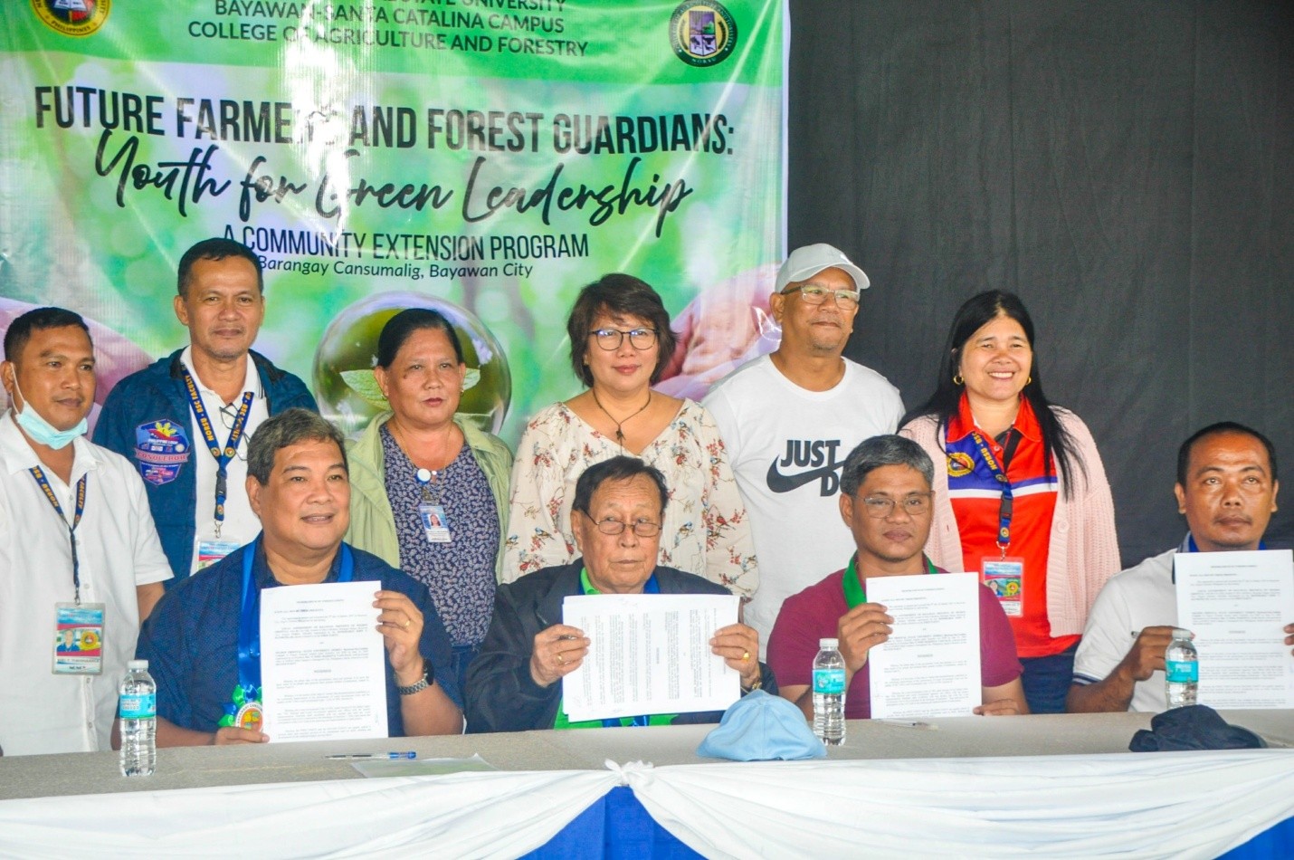 The Negros Oriental State University (NORSU), represented by University President Hon. Noel Marjon E. Yasi, and the Local Government Unit of Bayawan City, represented by City Mayor Hon. John T. Raymond, Jr., formally forged a partnership to implement the extension program “Future Farmers and Forest Guardians: Youth for Green Leadership.” The program, launched on August 22, 2025, is being conducted in Barangay Cansumalig, Bayawan City, with the MOA signing held at the Barangay Cansumalig Gymnasium.