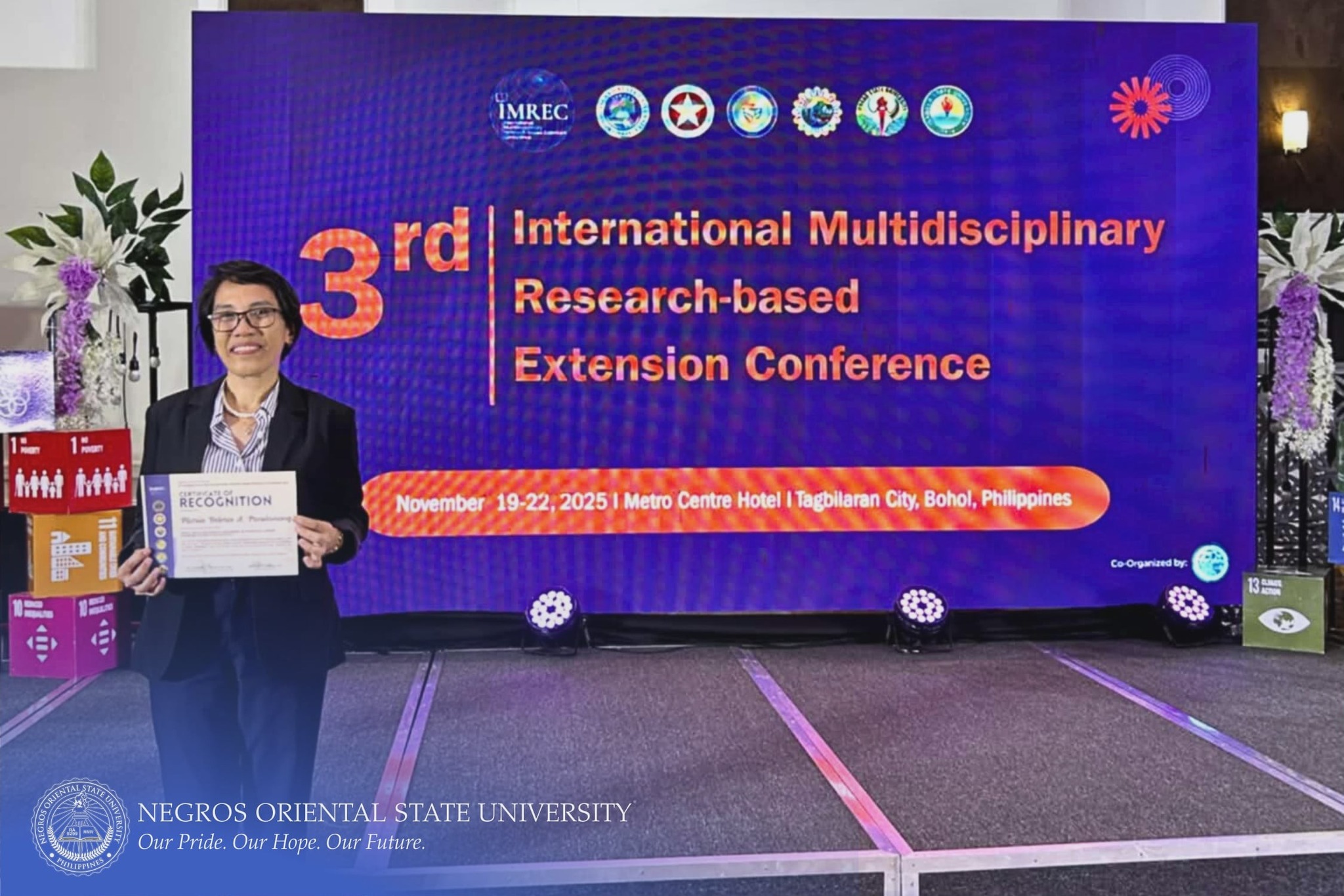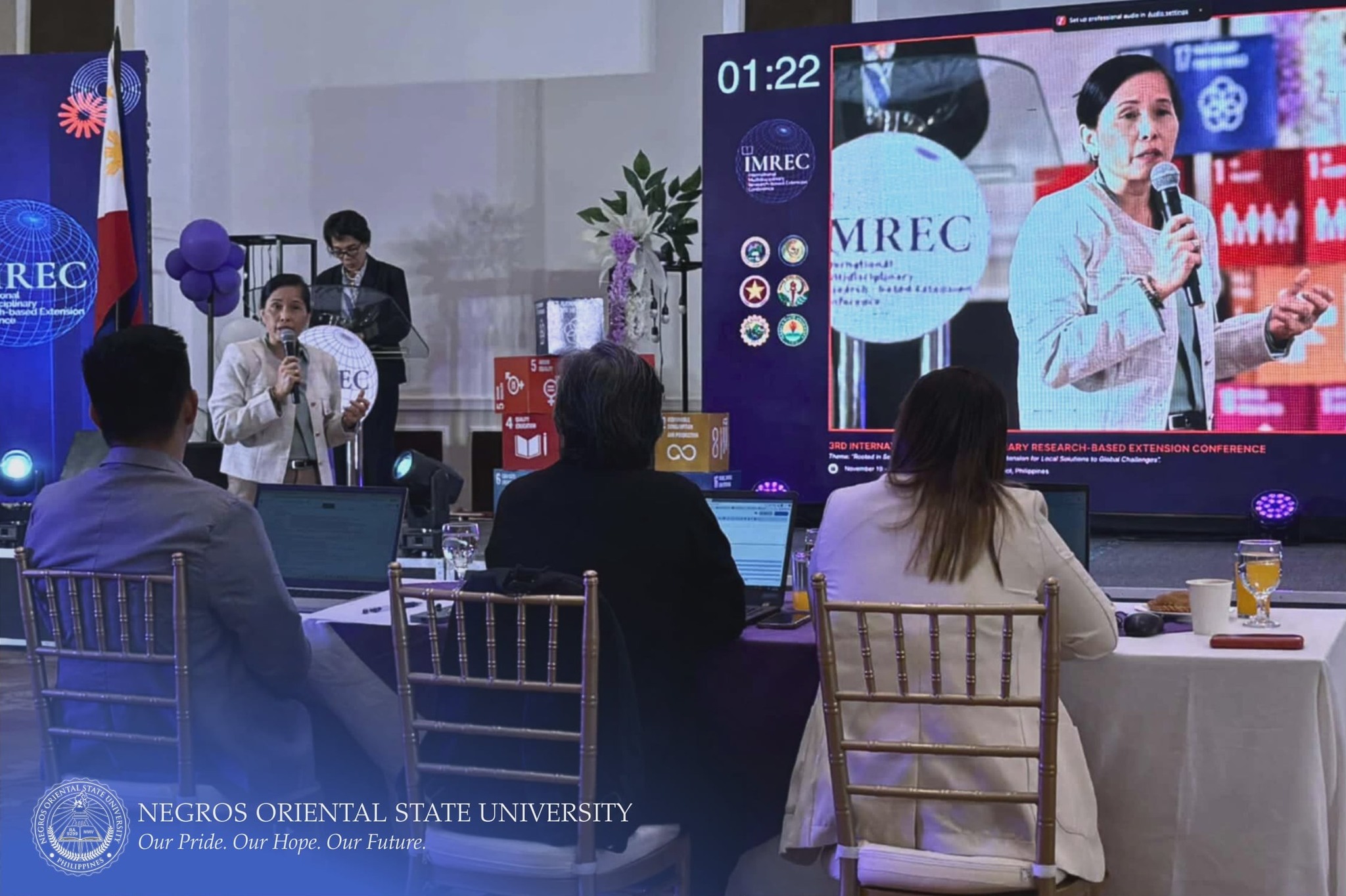 Negros Oriental State University was represented by three delegates at the recent 3rd International Multidisciplinary Research-based Extension Conference held at the Metro Center Hotel in Tagbilaran City, Bohol. Dr. Nora Maria Elena T. Osmeña, together with Dr. Michael P. Baldado, Jr. and Dr. Maria Dolores A. Paculanang, joined the 276 participants from 37 institutions who took part in the hybrid-format event.