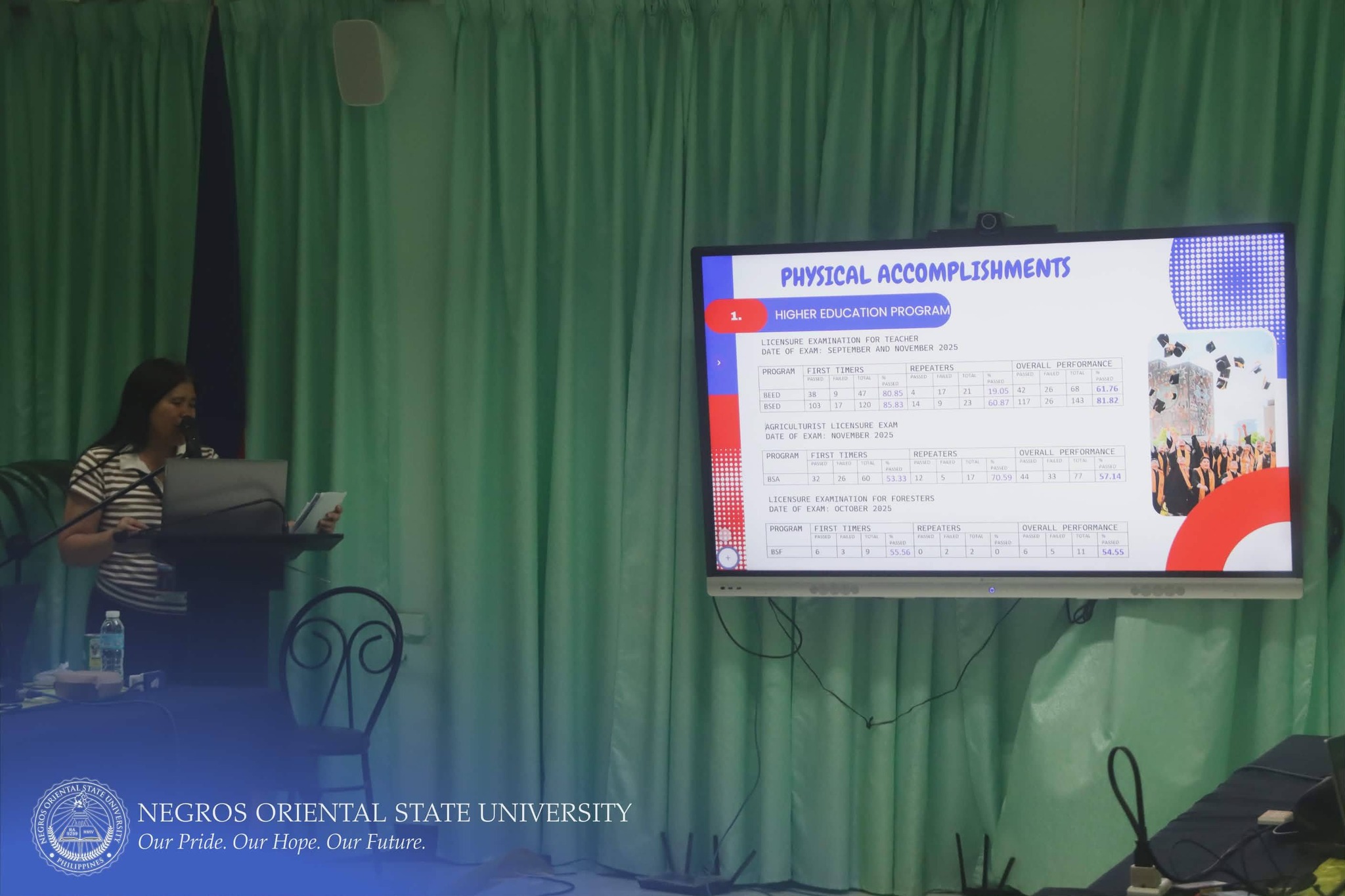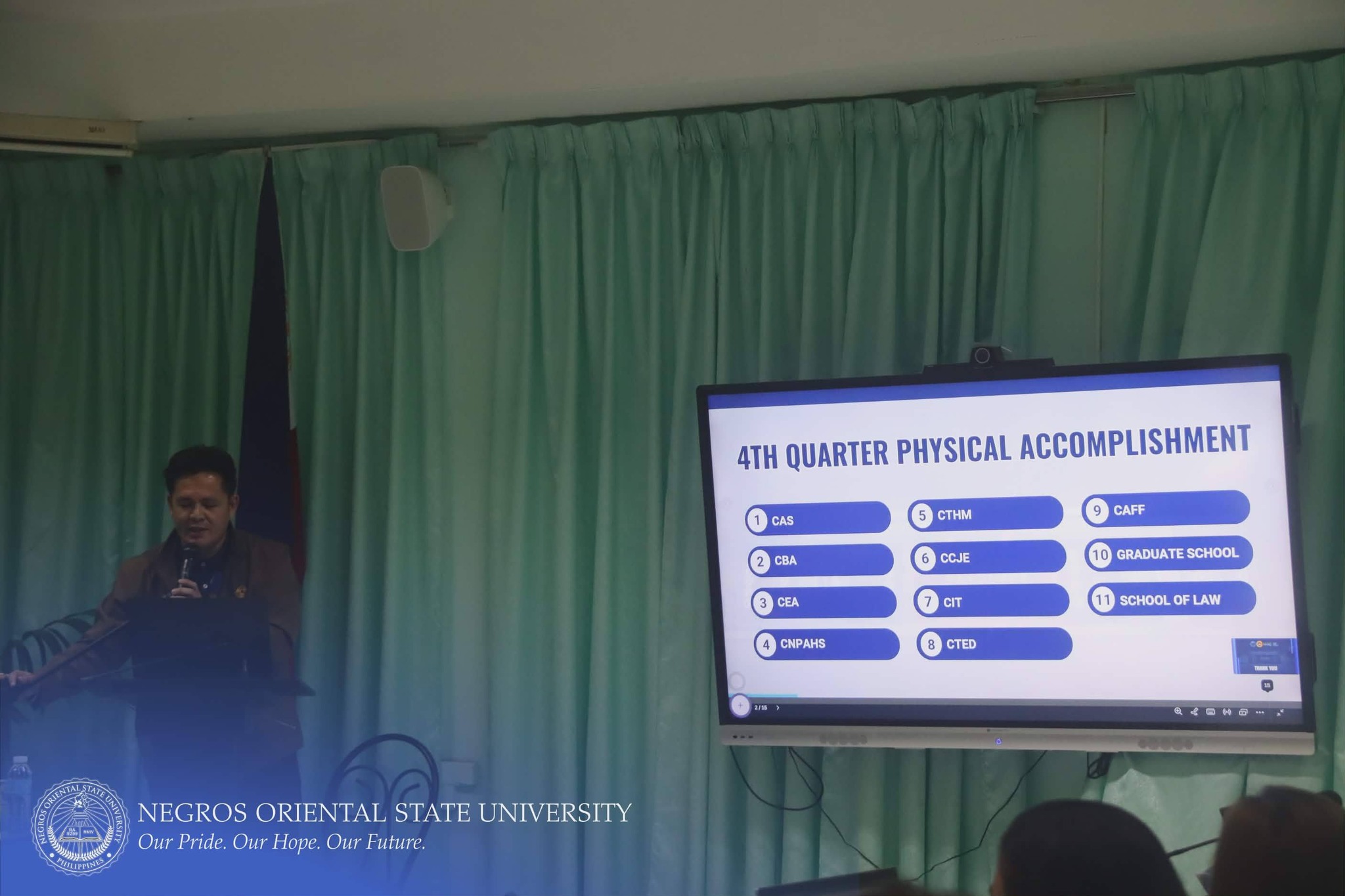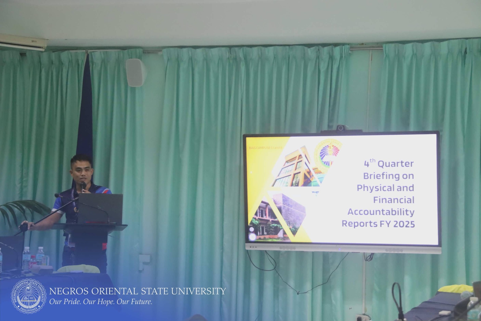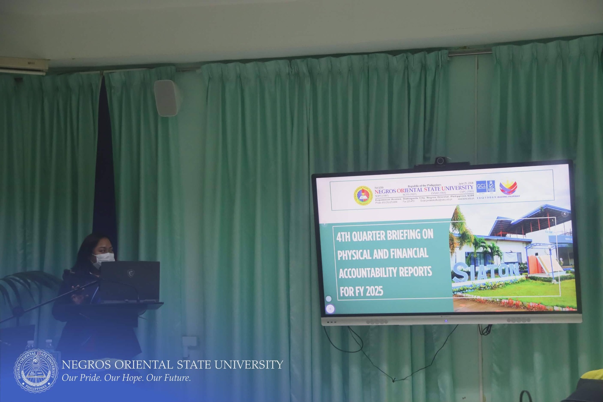Negros Oriental State University (NORSU) conducted its 4th Quarter Briefing on Physical and Financial Accountability Reports for Fiscal Year 2025 today, January 22, 2026, at the Main Campus AVR. The event was attended by university administrators and budget officers across all campuses. The briefing aims to review variances from the General Appropriations Act (GAA) targets and assess how funds are being utilized.