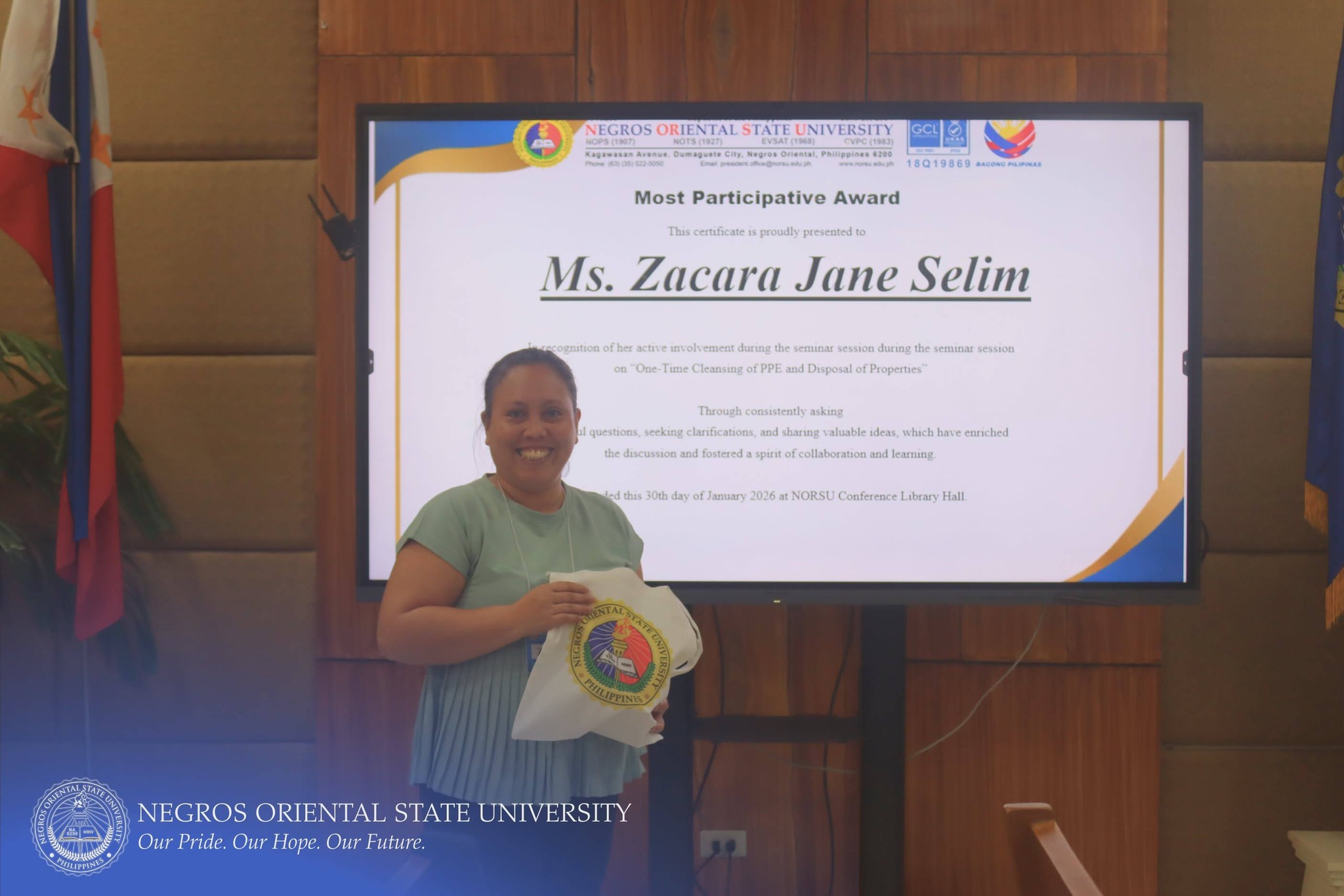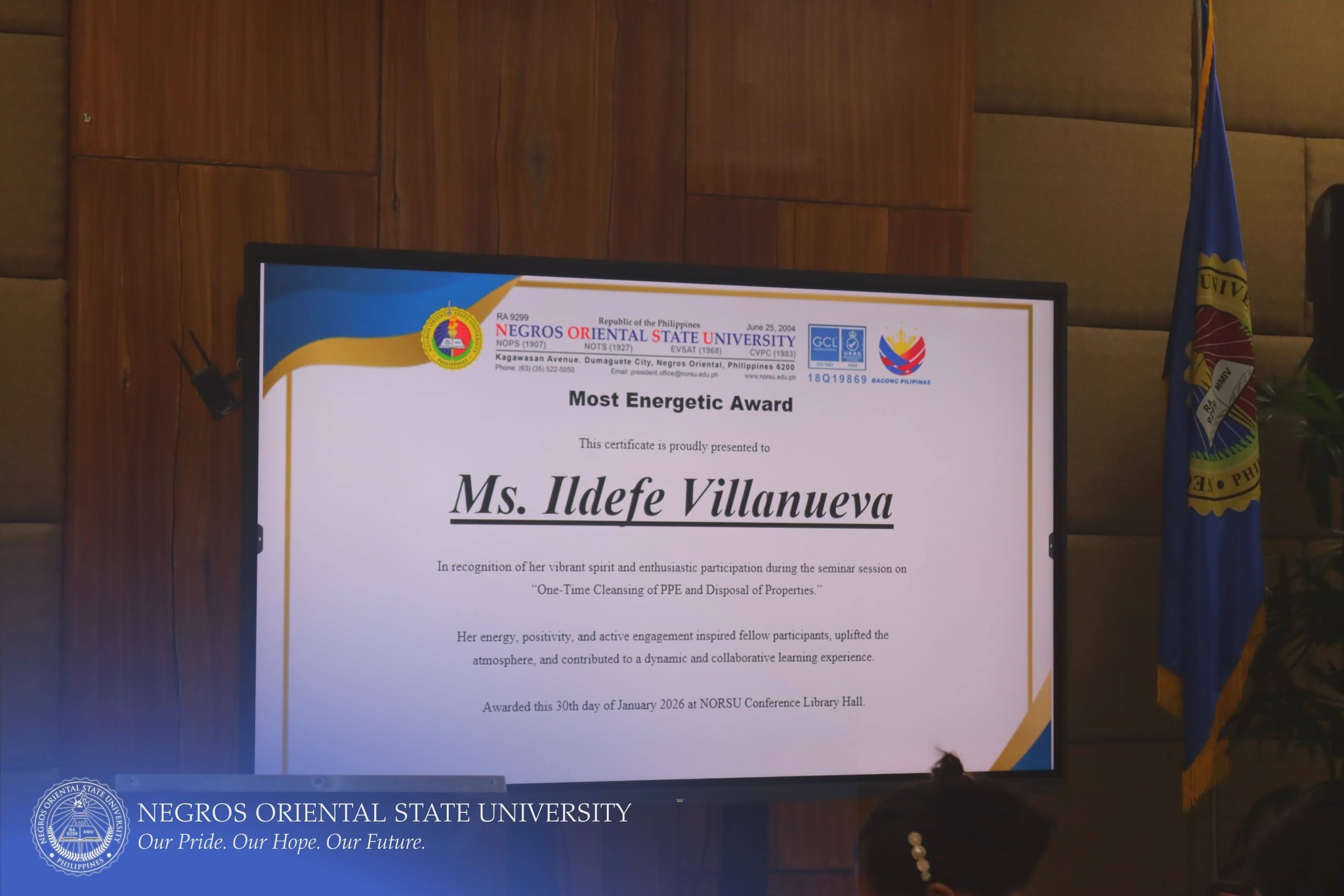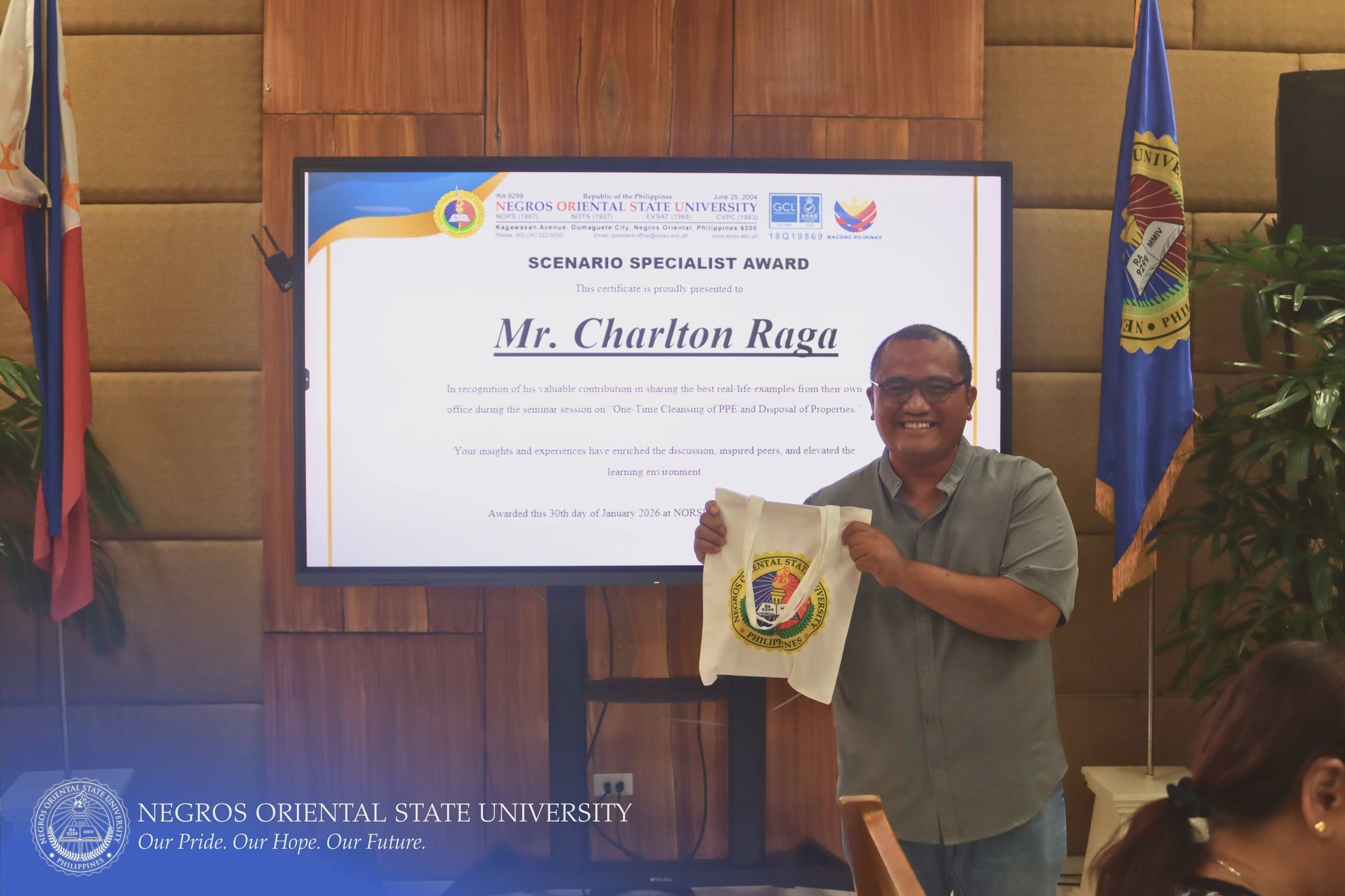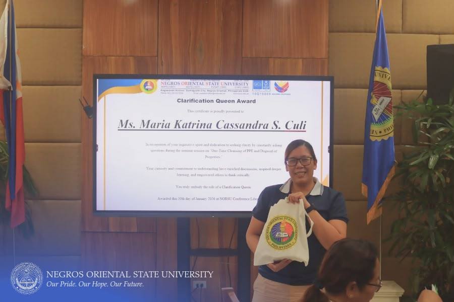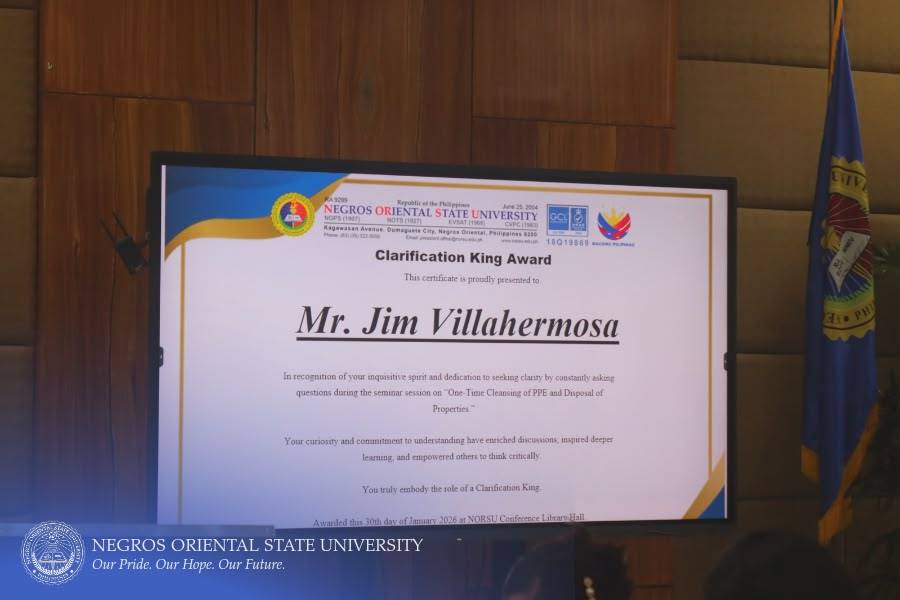 The Commission on Audit (COA) Regional Office No. VII, in collaboration with Negros Oriental State University (NORSU), conducted a comprehensive four-day seminar-workshop titled "One-time Cleansing of Property, Plant, and Equipment (PPE) Account Balances of Government Agencies and the Disposal of Government Properties". The event was held at the NORSU Main Campus Library Conference Room on January 27-30, 2026. It aims to orient and update personnel involved in property, supply, and accounting management on the proper procedures for PPE account reconciliation, documentation, and disposal of unserviceable properties in accordance with existing government accounting and auditing rules and regulations.
